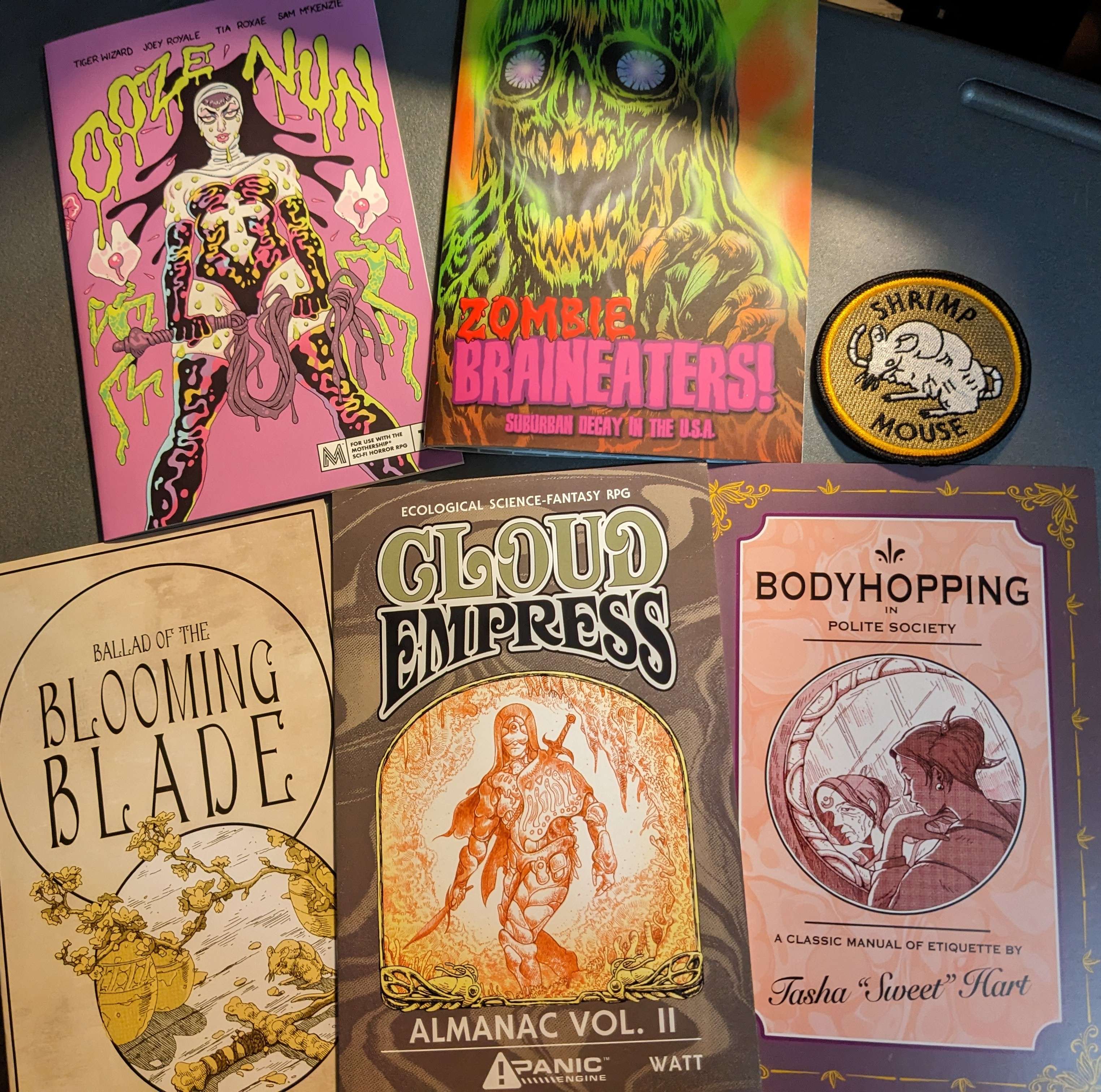 The three Cloud Empress zines and the shrimp-mouse patch are from the latest Worlds By Watt crowdfunding campaign "Stories From The Slip Vol. 1".